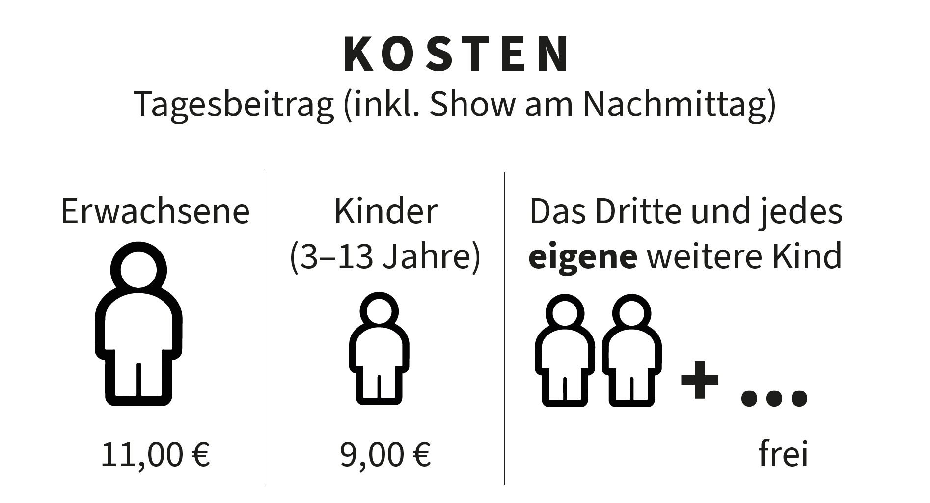 Der Tagesbeitrag ist an der Kasse am Eingang zu bezahlen. Familien, die den Eintritt in dieser Höhe nicht zahlen können, erhalten auf Rückfrage Ermäßigung. Sie sind uns genauso willkommen!